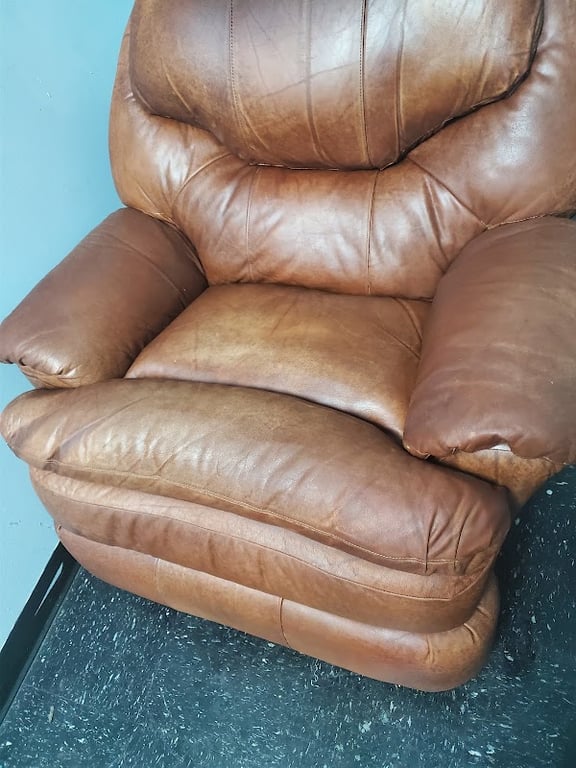 The image features a well-worn brown leather recliner, showcasing its soft texture and plush cushions.
