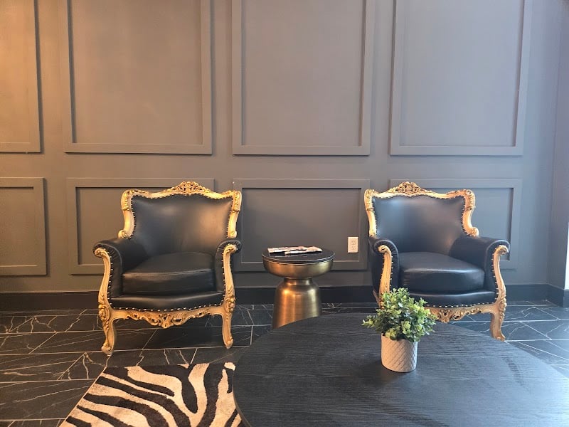 The image shows a stylish waiting area in a sewing store, featuring two ornate black chairs with gold accents.