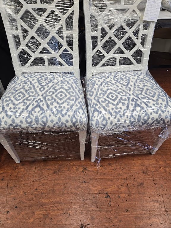 The image shows two wrapped chairs with a stylish blue and white patterned upholstery, set against a wooden floor.