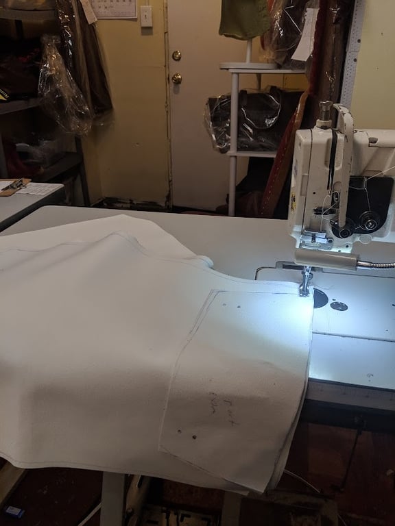 The image shows a sewing machine in a cozy workshop, with a partially sewn white fabric laid out on the table.