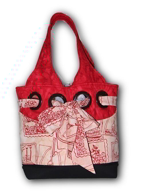 This image features a stylish red and patterned tote bag, showcasing intricate fabric designs and a unique bow detail.