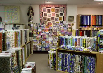 The image showcases the interior of Quilted Fox, a sewing store filled with vibrant fabric rolls neatly arranged on shelves.