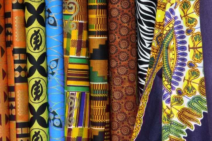 A vibrant array of fabrics is displayed, featuring rich colors and various patterns, including deep reds, oranges, yellows, greens, and browns.