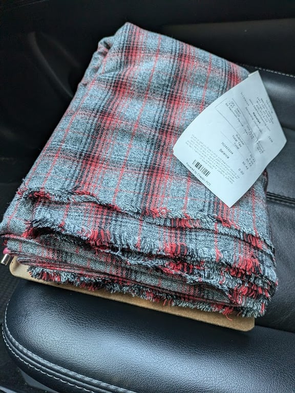 A folded piece of plaid fabric in gray and red rests on a black seat, accompanied by a receipt.