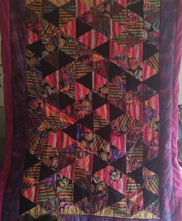 A vibrant quilt featuring a geometric pattern of colorful triangles is displayed prominently.