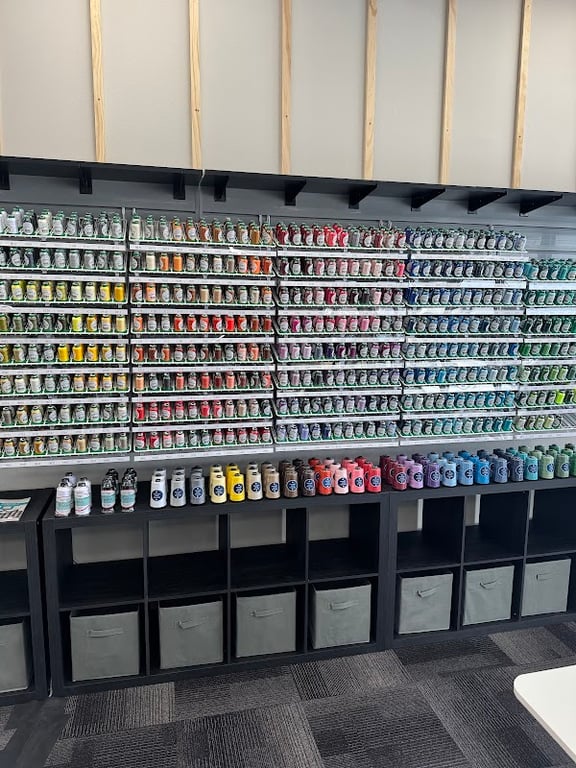 The image showcases a vibrant display of sewing threads organized on shelves at Yellowstone Sewing.