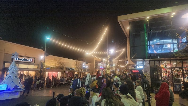 The image shows a bustling outdoor shopping area at night, illuminated by string lights. A crowd gathers near a Lids store, with festive decorations and a Christmas tree nearby.