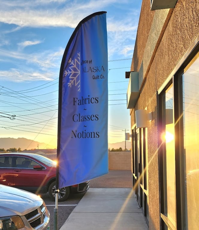 A vibrant flag outside Piece of Alaska Quilt Co. advertises "Fabrics, Classes, Notions" against a sunset backdrop.