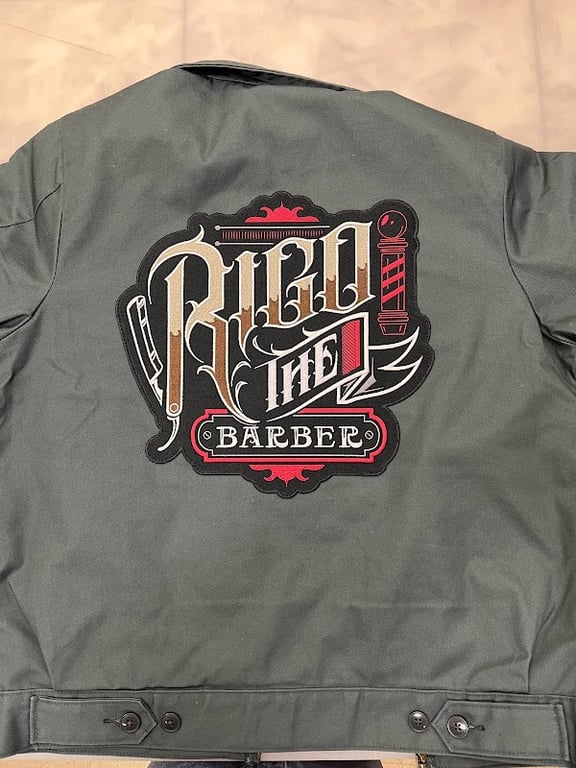 The image features a close-up of a dark green jacket displaying a vibrant embroidered logo that reads "Rigo the Barber.