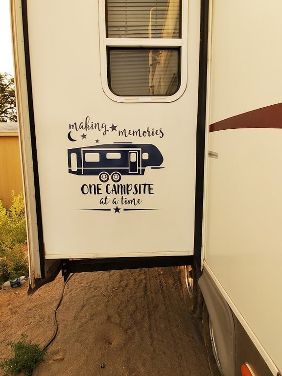 The image features a close-up of a camper's side, showcasing a decorative vinyl decal that reads "making memories one campsite at a time.
