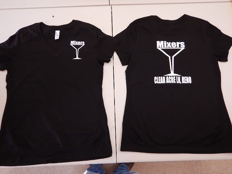 The image features two black v-neck t-shirts displayed side by side, each printed with the word "Mixers" and a martini glass graphic.