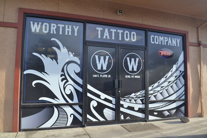 The image shows the storefront of a tattoo company, featuring bold lettering and intricate wave designs on the windows.