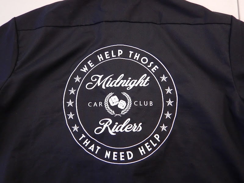 The image features a black jacket displaying a circular logo with the text "We Help Those Midnight Riders Car Club That Need Help.