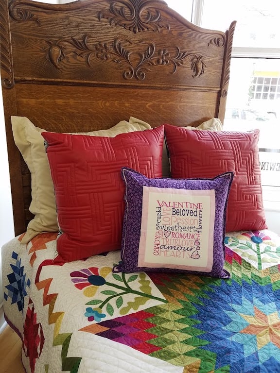 The image showcases a cozy display at Olde City Quilts, featuring a beautifully quilted bedspread adorned with colorful floral patterns.