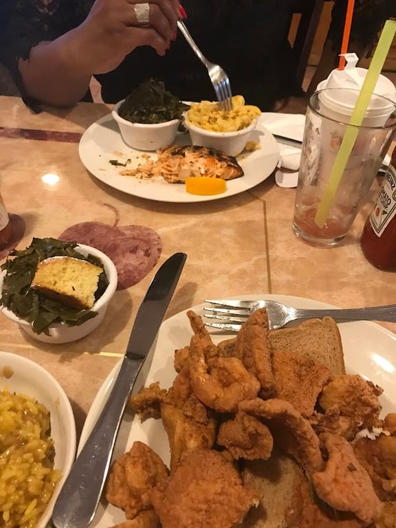 The image shows a table set with a variety of Southern dishes, including fried fish, collard greens, macaroni and cheese, and cornbread.