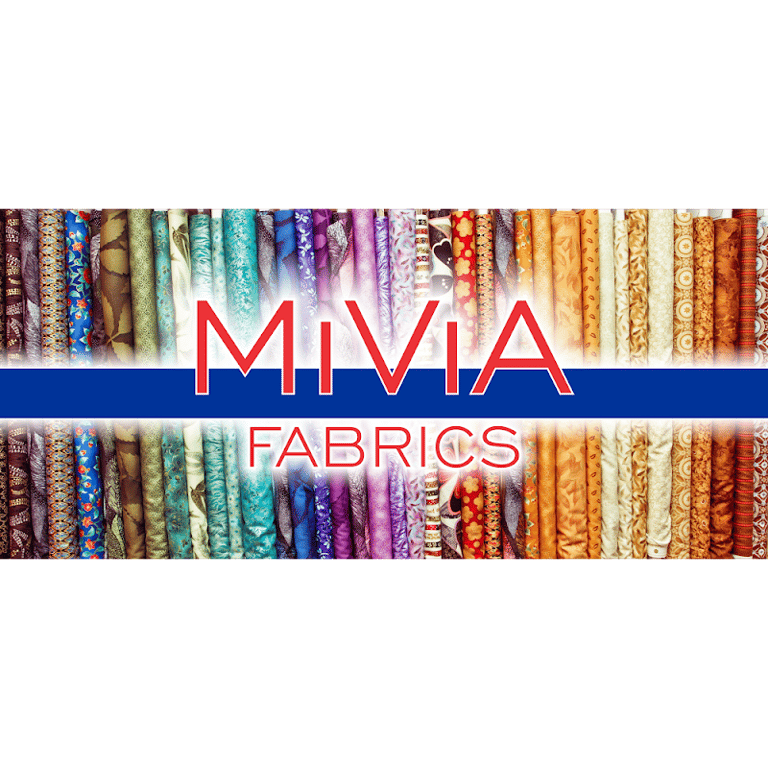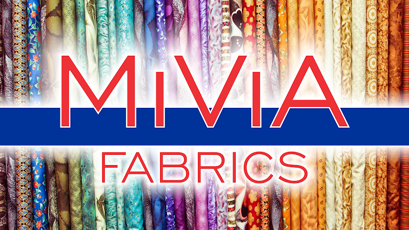 The image showcases a vibrant display of colorful fabrics at Mivia Fabrics, a sewing store.