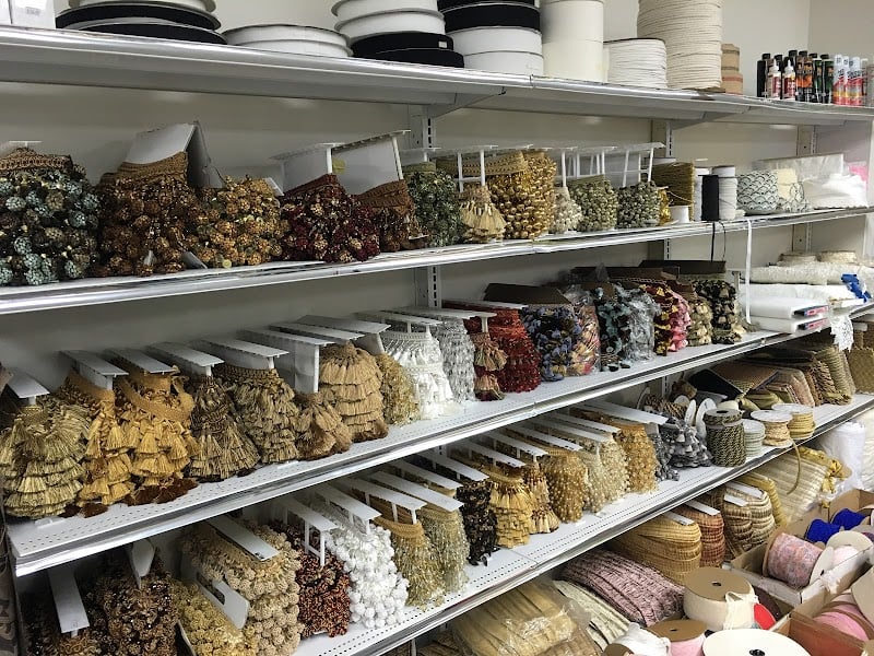 The image showcases a well-organized sewing store interior with shelves filled with various decorative trims, ribbons, and fabrics.