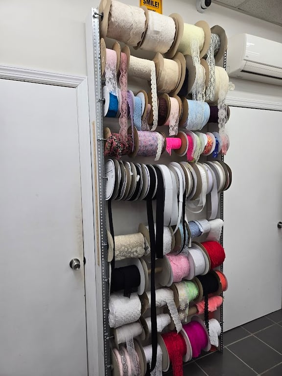 The image shows a well-organized display of colorful ribbons and lace on spools in a sewing store.