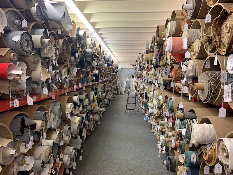 The image shows a spacious sewing store interior filled with neatly organized rolls of various fabrics on shelves.