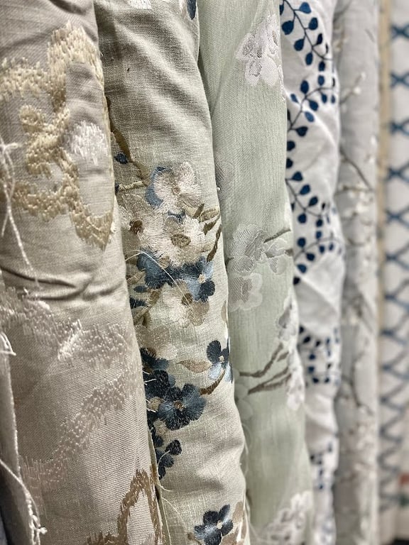 The image showcases two rolls of decorative fabric featuring intricate embroidery. One fabric has a geometric blue pattern, while the other displays colorful floral designs.