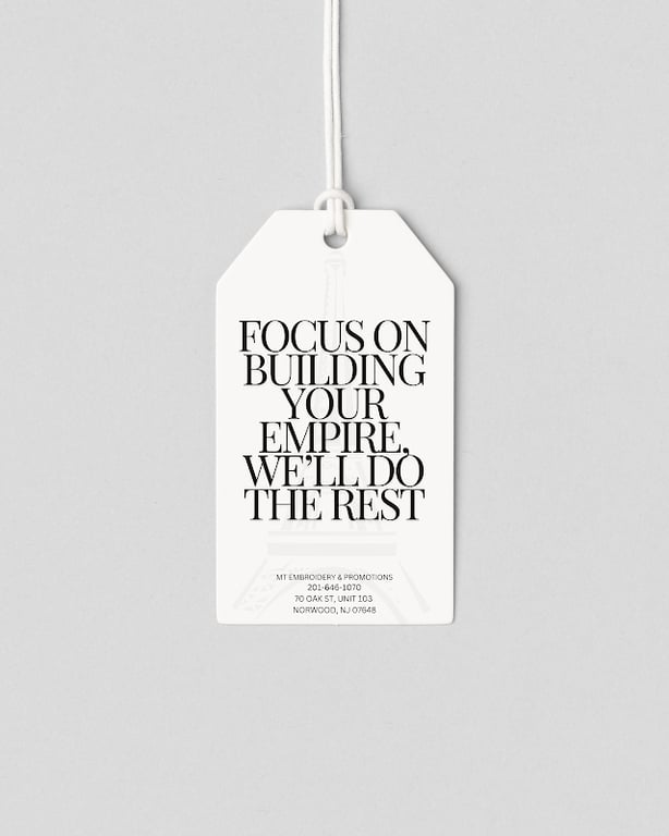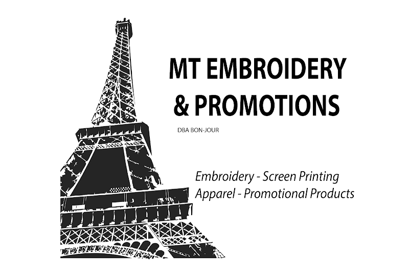 The image features the logo of MT Embroidery & Promotions LLC, showcasing a stylized Eiffel Tower.