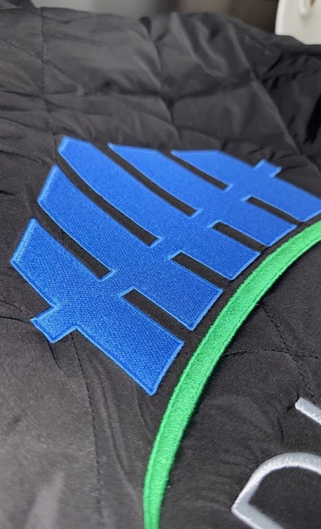 The image showcases a close-up of a black quilted fabric featuring a prominent blue embroidered logo and a green trim.