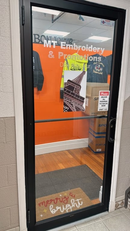 The image shows the entrance to Mt Embroidery & Promotions LLC, featuring a glass door with the store name displayed.