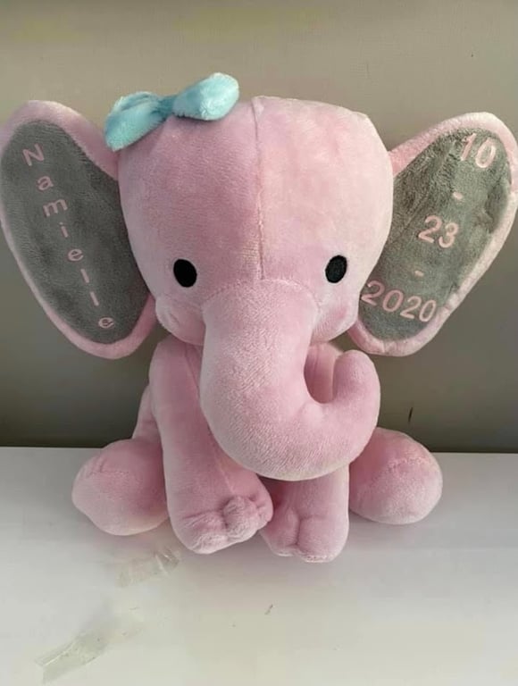 A soft pink elephant plush toy sits on a table, featuring a blue bow and personalized details on its ears.