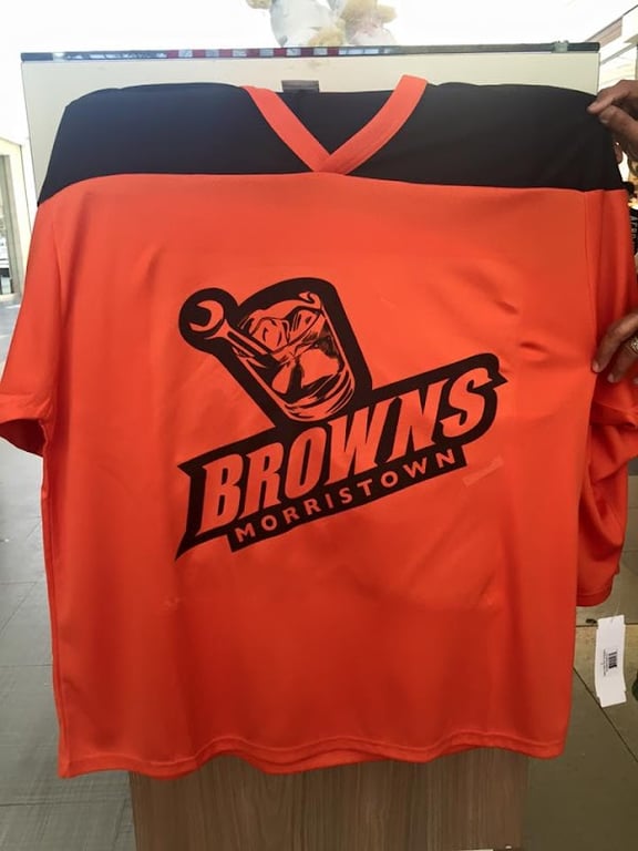 The image features an orange sports jersey with a black logo reading "BROWNS MORRISTOWN." It is displayed in a sewing store, showcasing custom printing capabilities.