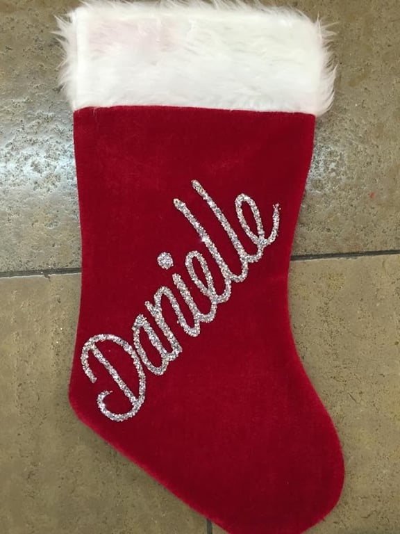 A vibrant red Christmas stocking with a fluffy white top features the name "Danielle" in sparkling silver lettering.
