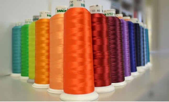 The image showcases a vibrant array of sewing thread spools in various colors, neatly arranged on a shelf.