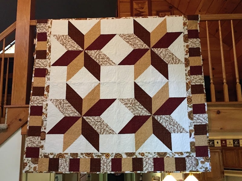 A beautifully crafted quilt featuring star patterns in rich burgundy, cream, and tan hangs prominently in a cozy sewing store.