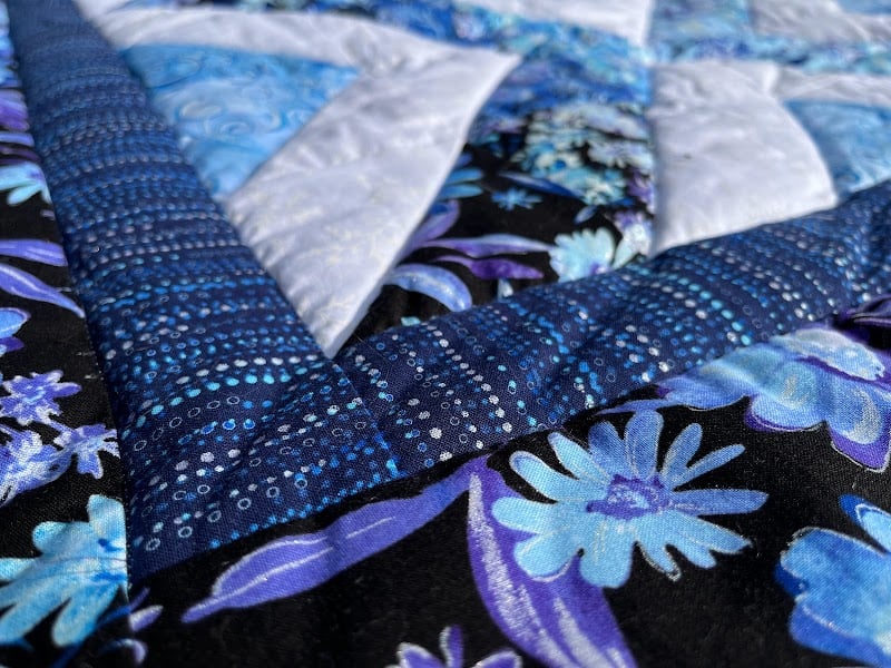 A close-up of a beautifully crafted quilt showcases intricate patterns in shades of blue and black, featuring floral designs and textured fabrics.