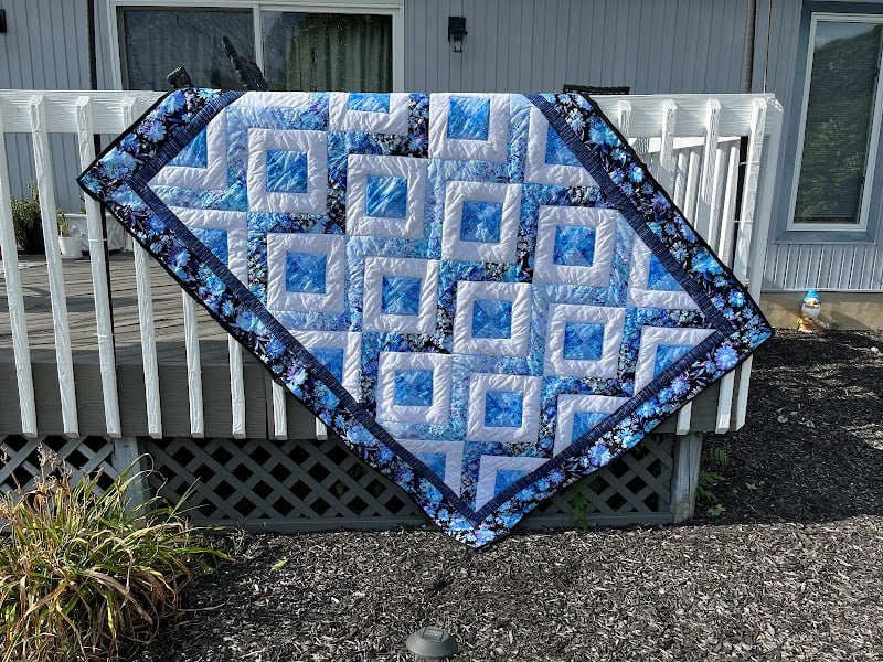 A beautifully crafted quilt featuring a geometric pattern in shades of blue and white is displayed outdoors.