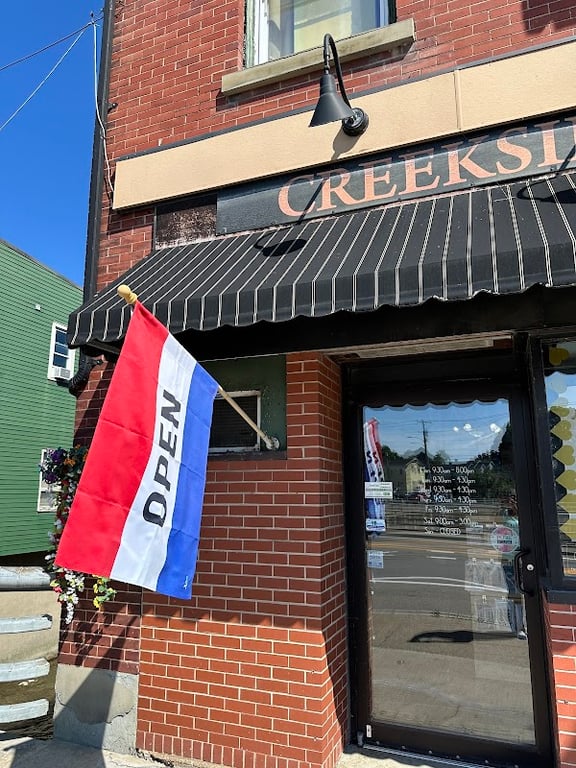 The image shows the exterior of Creekside Fabrics, Quilts & Yarn, featuring a red, white, and blue "OPEN" flag.