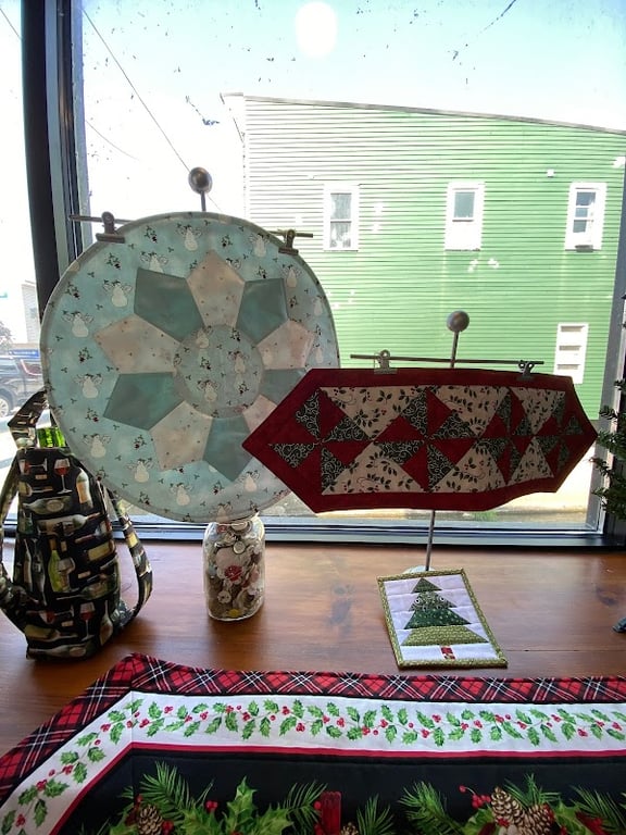 The image showcases a vibrant display of quilting projects at Creekside Fabrics, featuring a circular quilt with a snowman design and a red diamond-patterned piece.