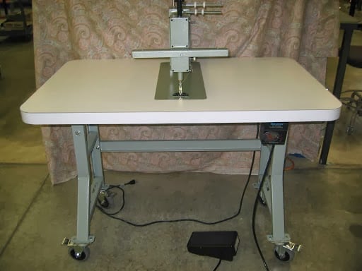 The image shows a sturdy sewing table equipped with a sewing machine, set against a backdrop of patterned fabric.