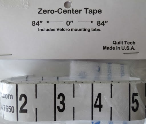 The image features a package of Zero-Center Tape, measuring 84 inches, designed for quilting. The tape includes Velcro mounting tabs and is labeled with clear measurements.