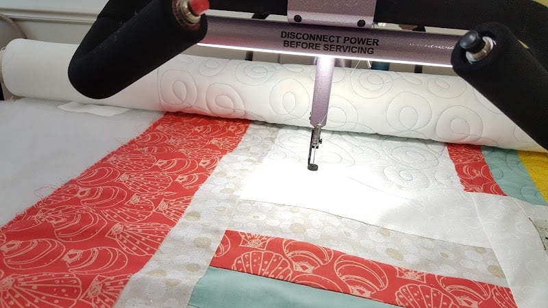 The image showcases a quilting machine in action, with colorful fabric pieces featuring various patterns laid out beneath it.