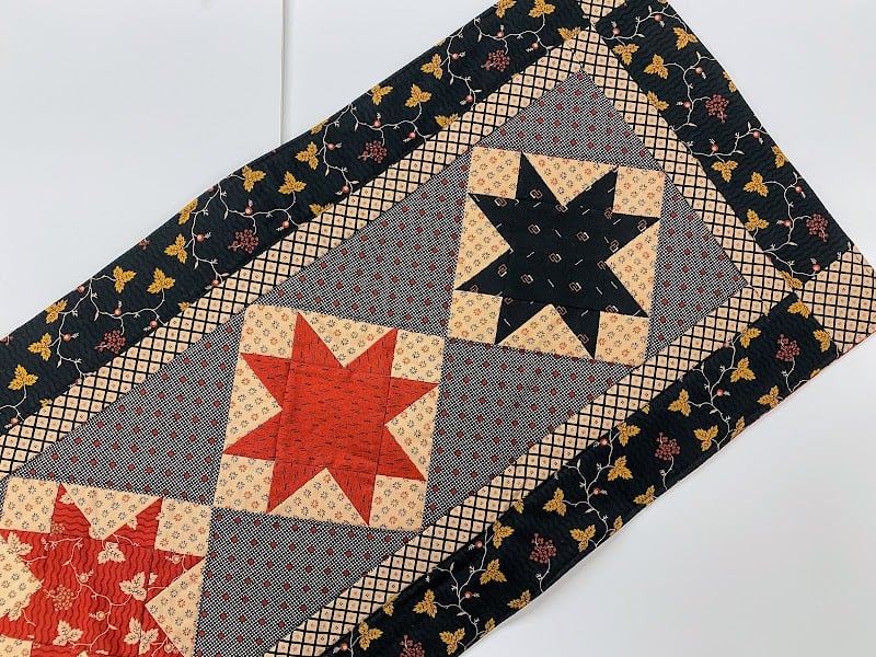 This image features a beautifully crafted quilt with star patterns in red, black, and cream, showcasing intricate stitching.