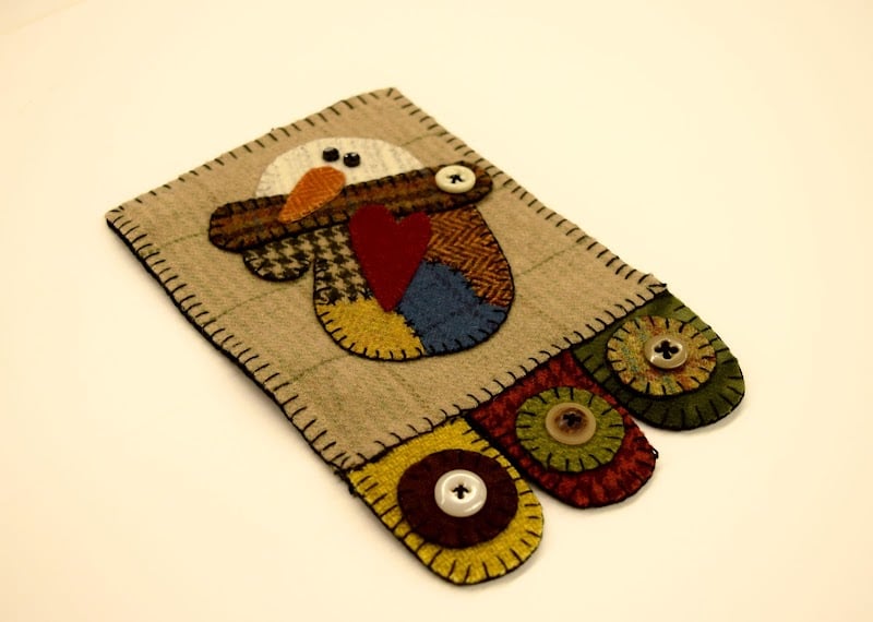A colorful, handmade fabric decoration features a whimsical bird design with various patterned fabrics and buttons.