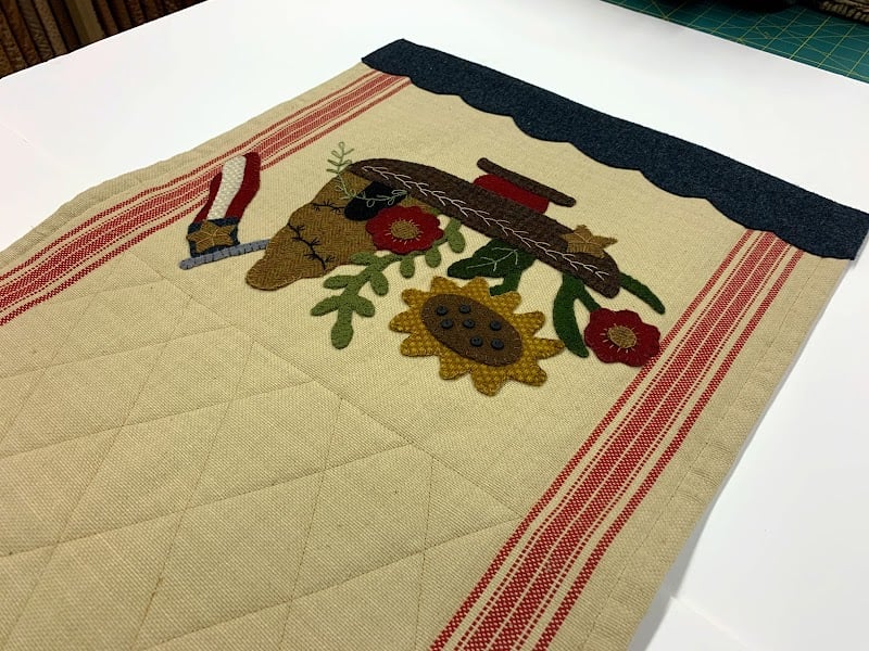 The image showcases a beautifully crafted quilted wall hanging featuring a sewing theme, with vibrant appliqué flowers and a spool of thread.