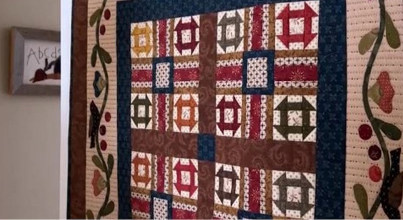 A vibrant quilt featuring intricate patterns in red, green, and blue hangs prominently on the wall, surrounded by decorative elements.