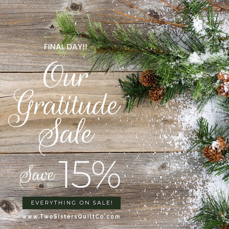 A rustic wooden background features festive greenery and pinecones, promoting Two Sisters Quilt Co's "Gratitude Sale" with a 15% discount.