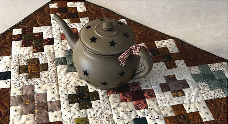 A decorative teapot with star cutouts sits atop a beautifully quilted table runner featuring a patchwork design in warm colors.