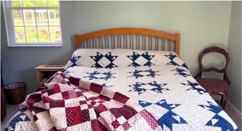 A beautifully made bed features a quilt with blue and red star patterns, complemented by a cozy, draped quilt in rich burgundy and cream.