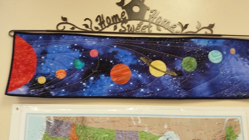 The image features a vibrant quilt depicting the solar system, showcasing colorful planets against a dark blue background. It is displayed on a wall in the Sew What?