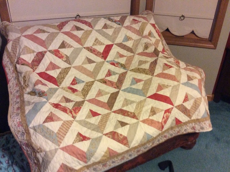 A beautifully crafted quilt featuring a geometric pattern of triangles in warm colors rests on a wooden bed frame.