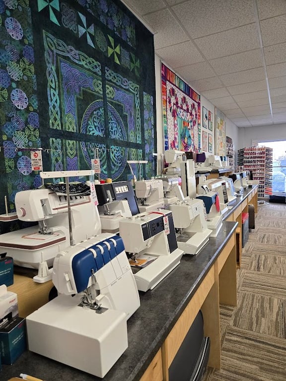 The image showcases a well-organized sewing store interior featuring a row of sewing machines on display. Colorful quilts adorn the walls, enhancing the vibrant atmosphere.