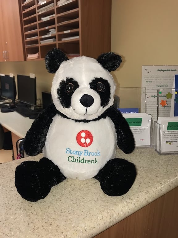 The image features a plush panda toy with a logo for Stony Brook Children's on its belly, sitting on a countertop in a sewing store.